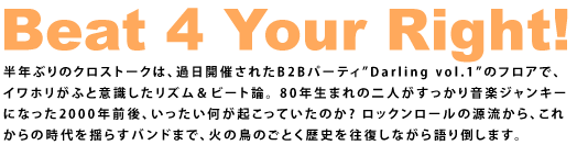 そうそう(笑)。だから、最初に俺が言った「踊れるロック」なんて言葉は本来語義矛盾も甚だしいのよ。 |